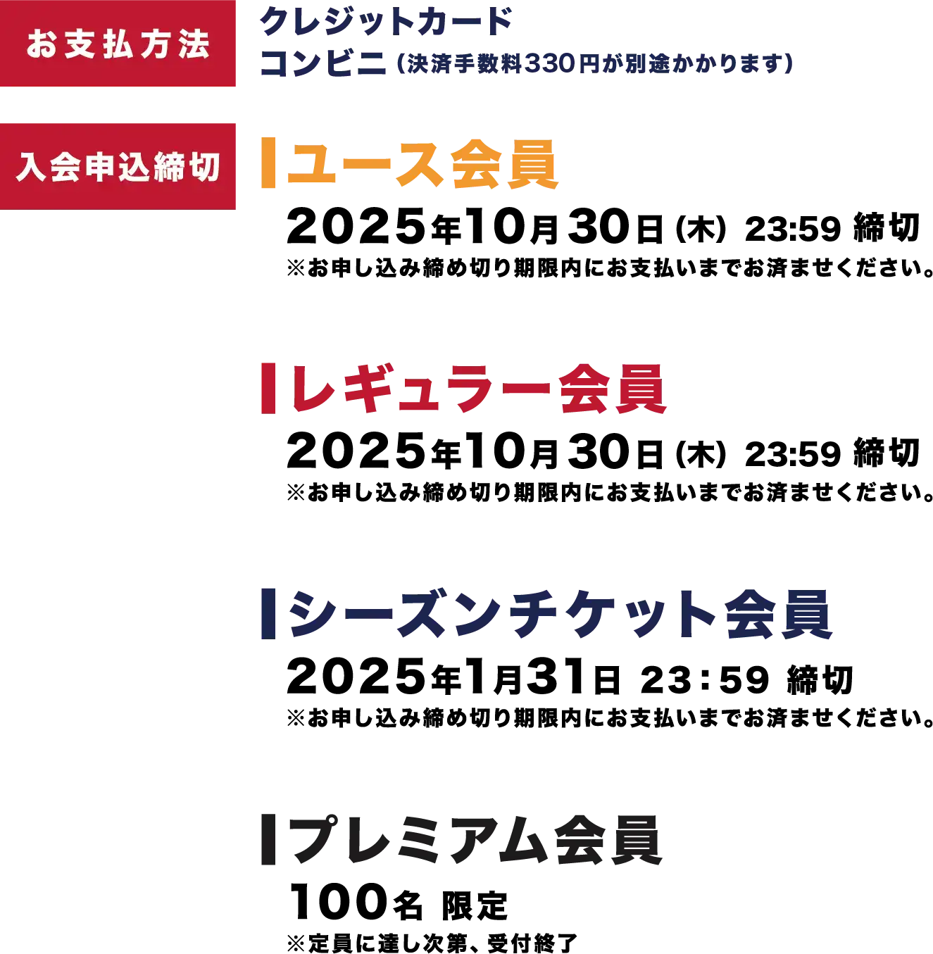 ・ユース会員、高校生以下のシーズンチケット対象者は「2025年4月時点で高校3年生以下の方」が対象となります。2025年3月に高校卒業見込みの方は、レギュラー会員・シーズンチケット(大人)でお申し込みください。