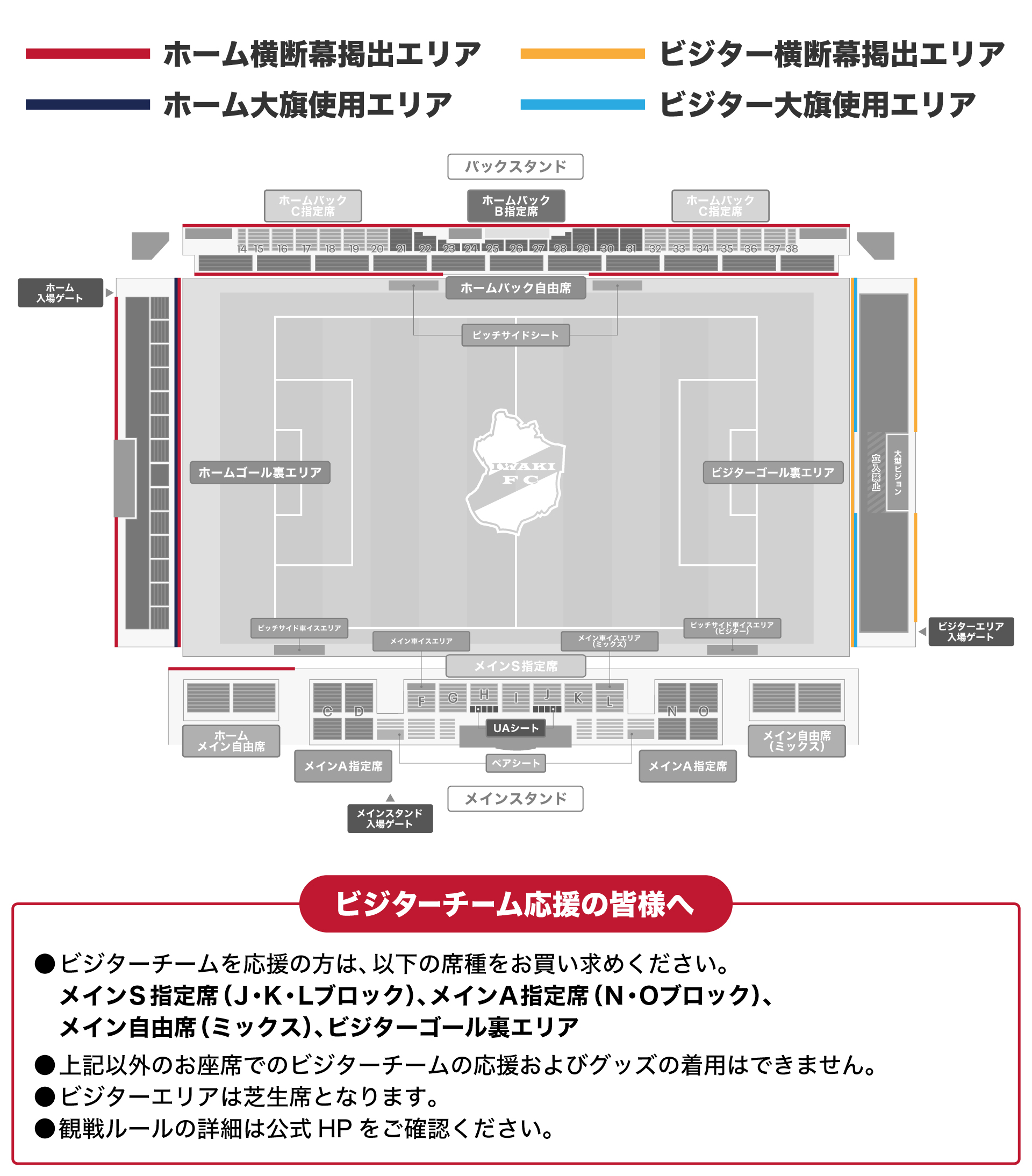 ・立ち見については、いわきFCサポーターはホーム側のゴール裏、ビジターサポーターはビジター側のゴール裏でのみ可能です。メインスタンドおよびバックスタンドでの立ち見はできません。