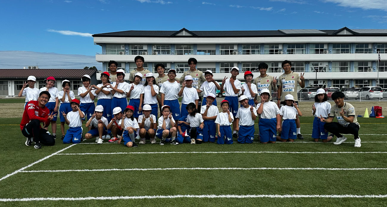 3校時目の授業に参加し、3〜6年生の児童と一緒にサッカー教室を行い、笑顔溢れる時間となりました。