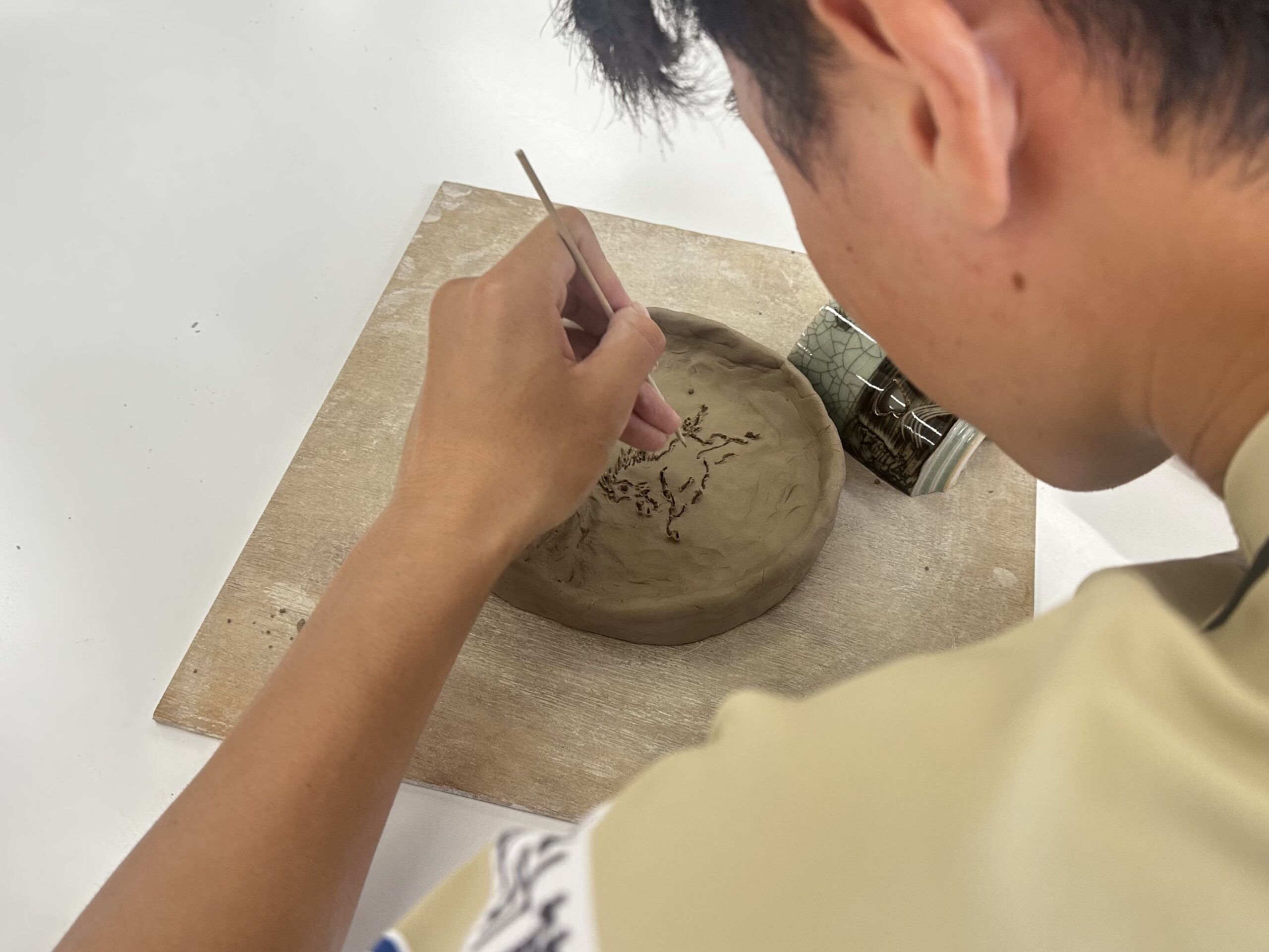 大堀相馬焼協同組合理事長 休閑窯 半谷秀辰 様に、大堀相馬焼の歴史や特徴である「青ひび」「二重構造」「走り馬」について教えていただき、手びねり陶芸体験を行いました。