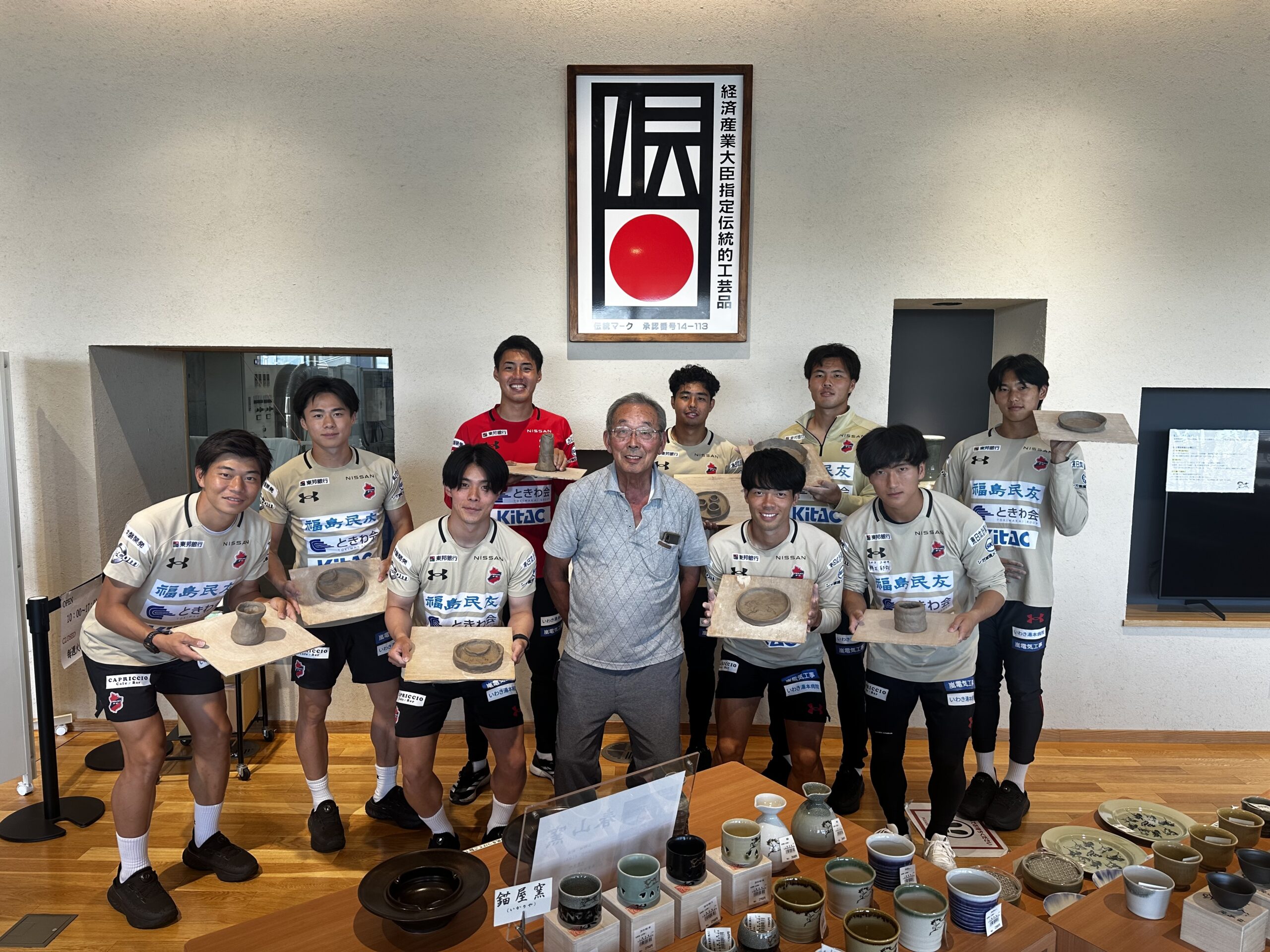 いわきFCトップチーム選手9名が、道の駅なみえ なみえの技・なりわい館にて、浪江町伝統工芸品「大堀相馬焼陶芸体験」を実施いたしました。