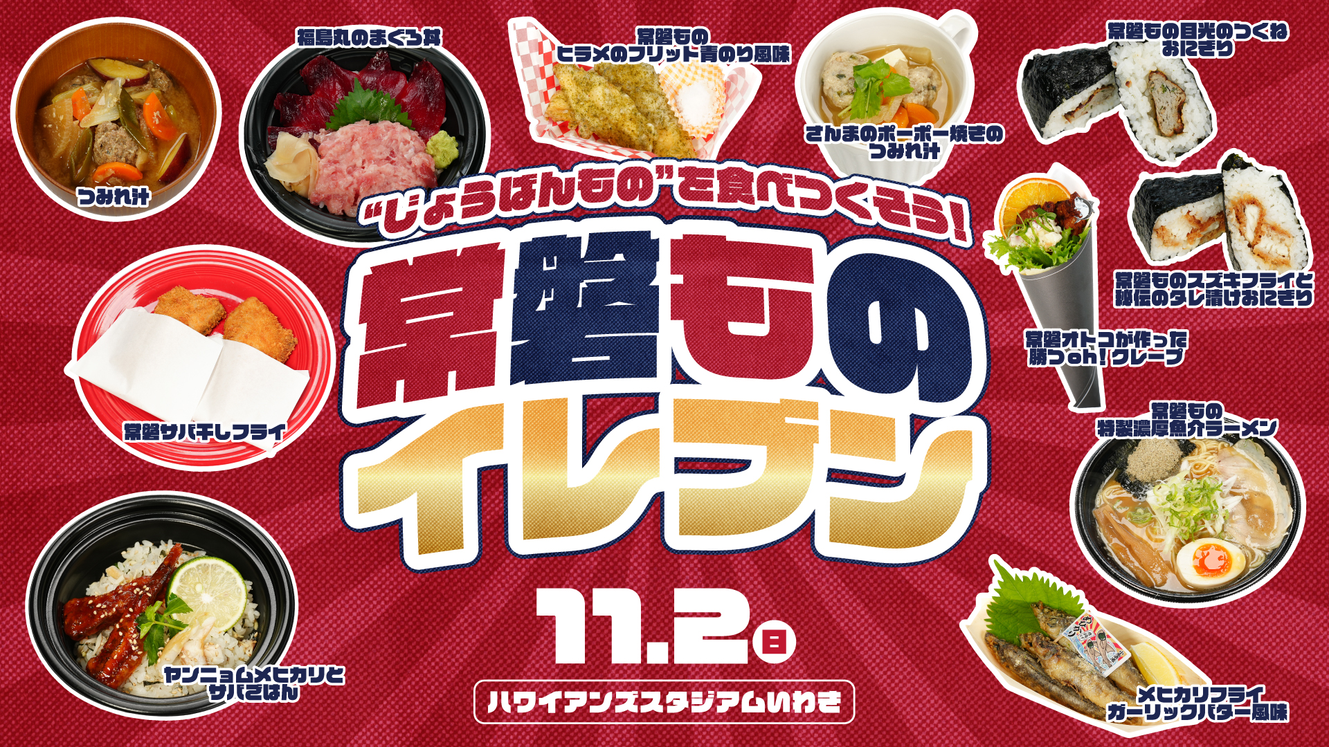 いわきFCのスタジアムグルメに出店する9店舗が趣向を凝らした「常磐もの」スペシャルメニュー全11種類がエントリー。