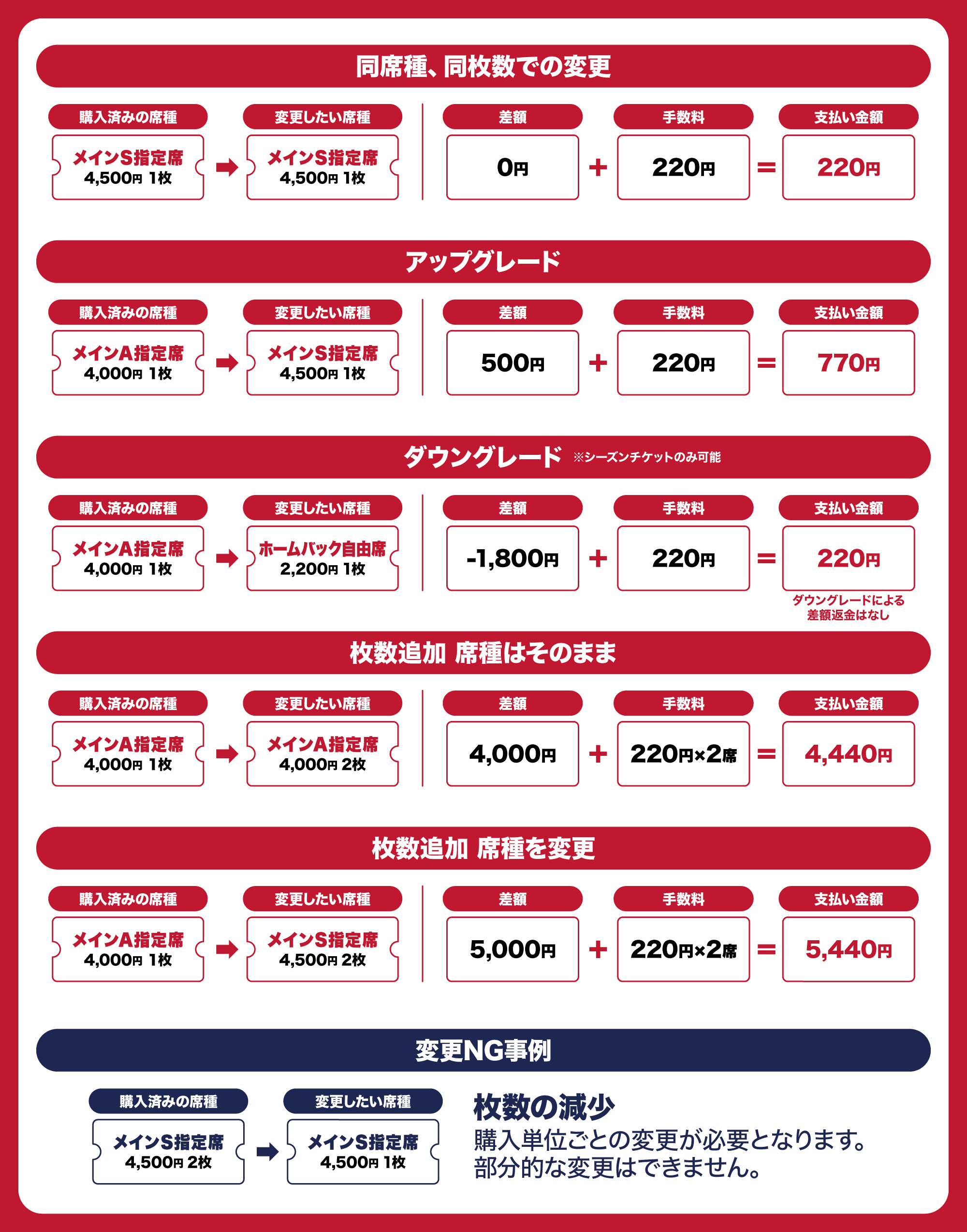 シーズンチケットをお持ちの方は、1試合あたりのチケットを以下の金額で購入したとして席変更サービスをご利用いただくことが可能です。