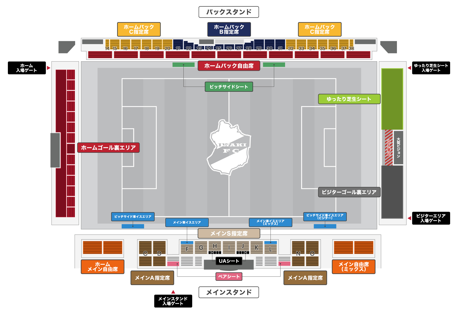 メインS指定席、メインA指定席、メイン自由席、メイン車イスエリア、ホームバックB指定席、ホームバックC指定席、ホームバック自由席、ホームゴール裏エリア、ビジターゴール裏エリア、ビジターバック自由席、ゆったり芝生シート