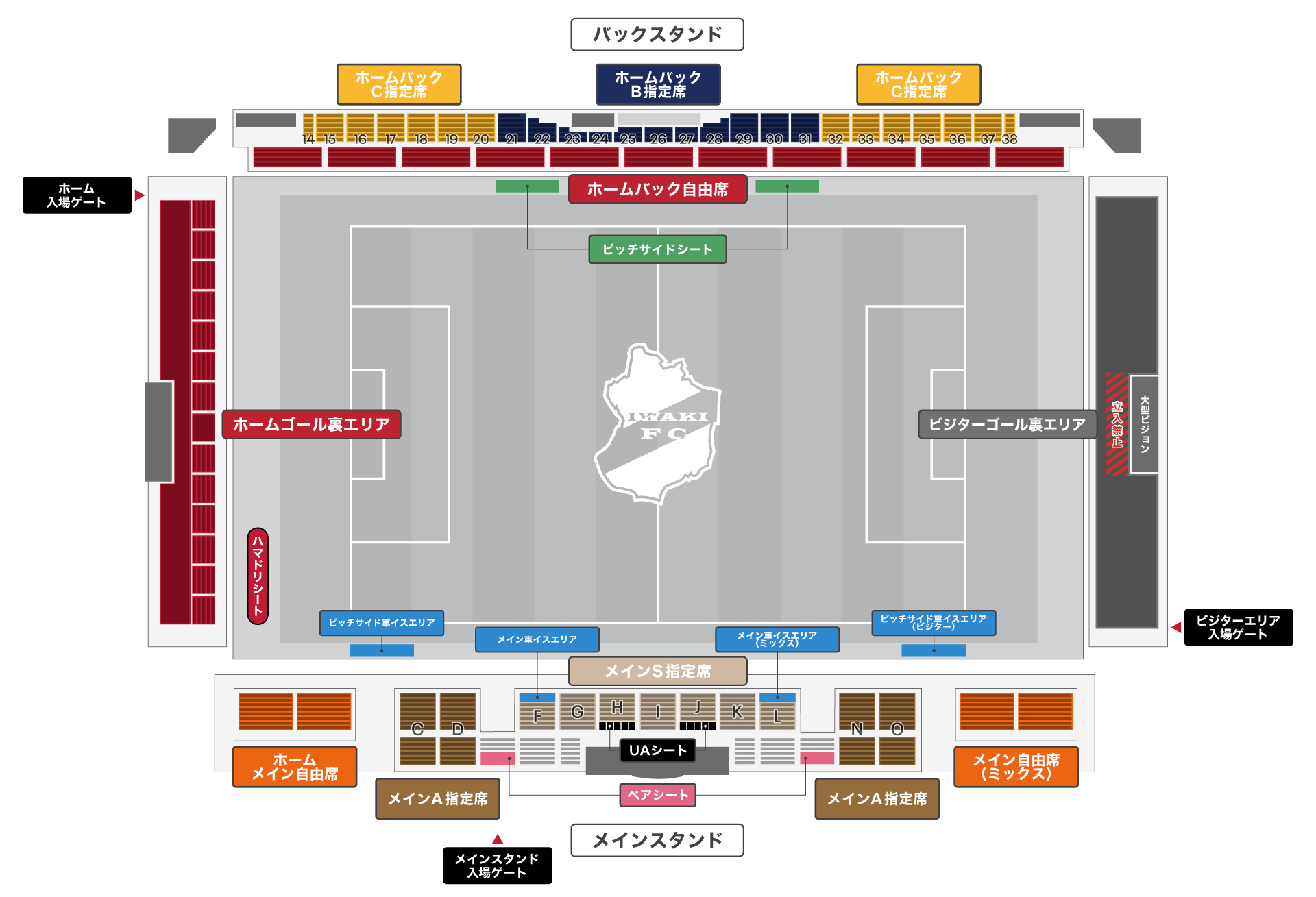 メインS指定席、メインA指定席、メイン自由席、メイン車イスエリア、ホームバックB指定席、ホームバックC指定席、ホームバック自由席、ホームゴール裏エリア、ビジターゴール裏エリア、ビジターバック自由席、ゆったり芝生シート